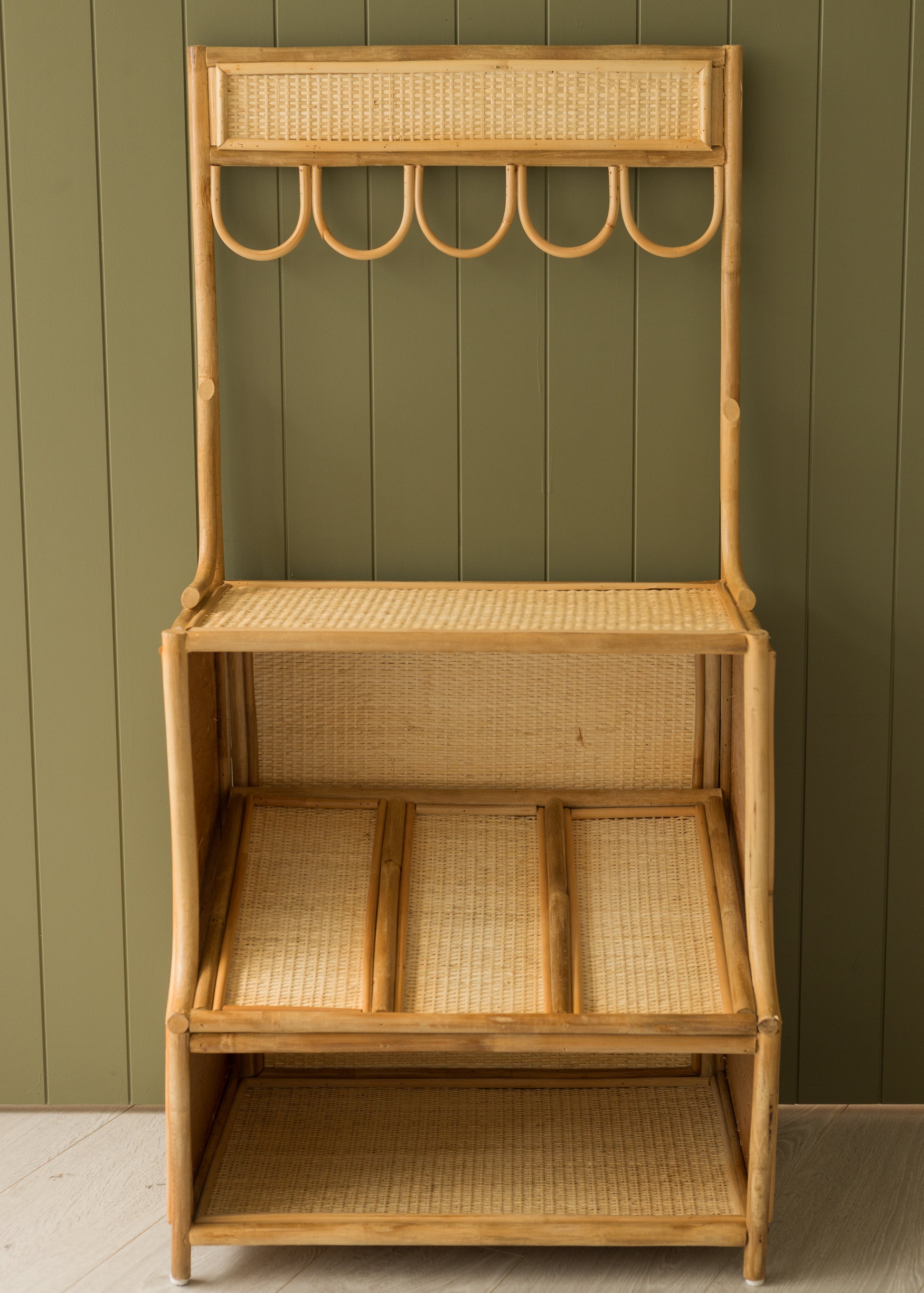 With open shelving for displaying goods and a sweet arched canopy frame, the Rattan Market Stand fits beautifully into any playroom, home, or early childhood space. Its neutral tones and natural texture make it both a stunning decor piece and a functional hub for role play.